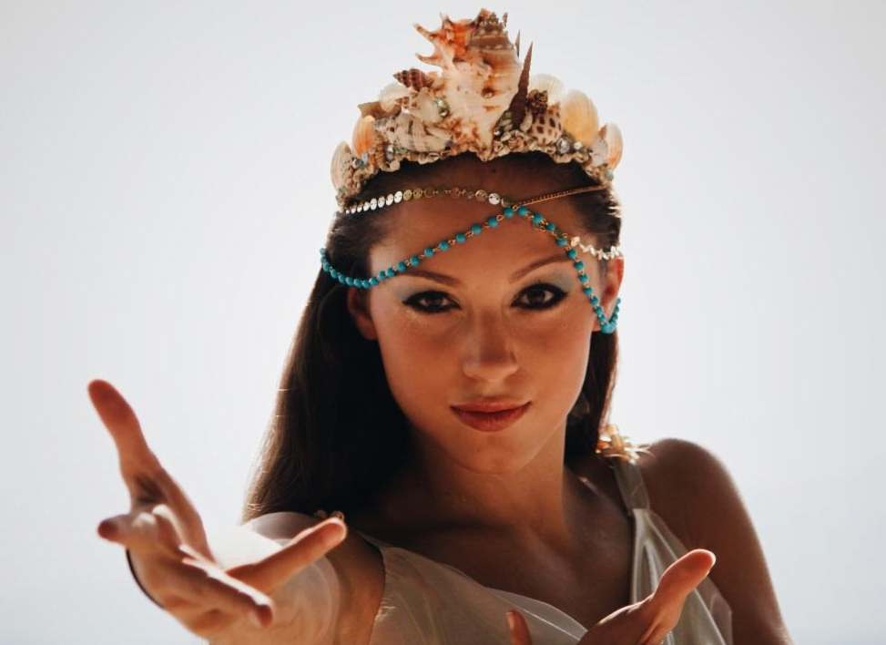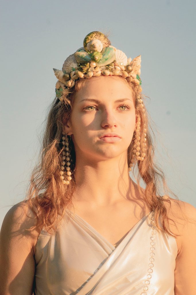 “The iridescent fabric gives them an ethereal quality. To top off the look, the mermaids are adorned with crowns of seashells and beads as though they were ocean royalty.”